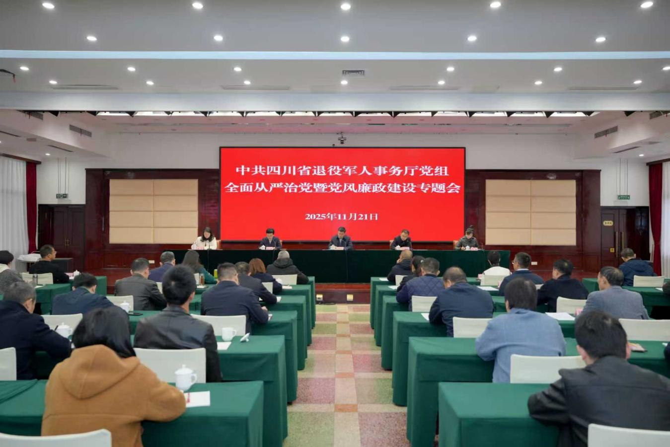 11月21日上午,退役军人事务厅召开2025年度下半年全面从严治党和党风廉政建设专题会,驻厅纪检监察组通报了纪检监察相关工作及派驻监督开展情况,厅党组书记、厅长熊隆东出席会议并讲话。厅领导班子成员、二级巡视员,厅机关及驻厅纪检监察组全体干部,各直属单位班子成员参加会议。